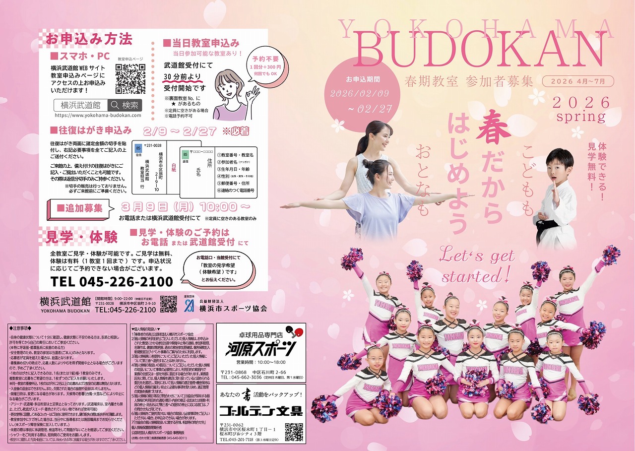 春から新しいことを始めたい方は、ぜひ横浜武道館へお越しください。